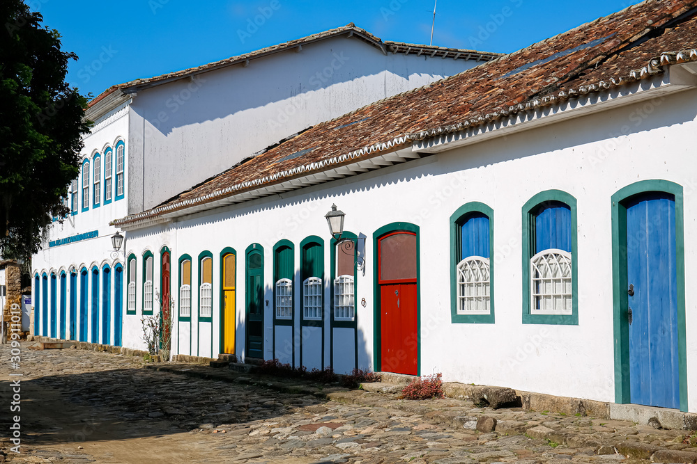 Typical house facades with colorful doors and windows on sunny day in historic town Paraty, Brazil, Unesco World Heritage