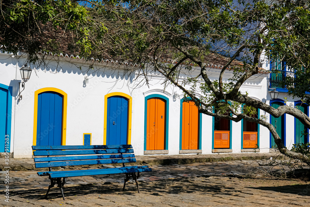 View to colonial house facades with colorful wooden doors in sunshine with a blue bench and tree branches in front, historic town Paraty, Brazil, Unesco World Heritage