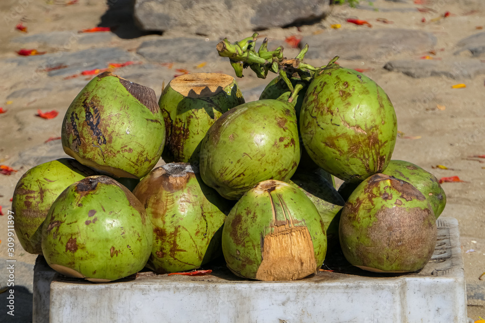 Close up of fresh green coconuts stacked ready to sell on a market in historic town Paraty, Brazil, Unesco World Heritage