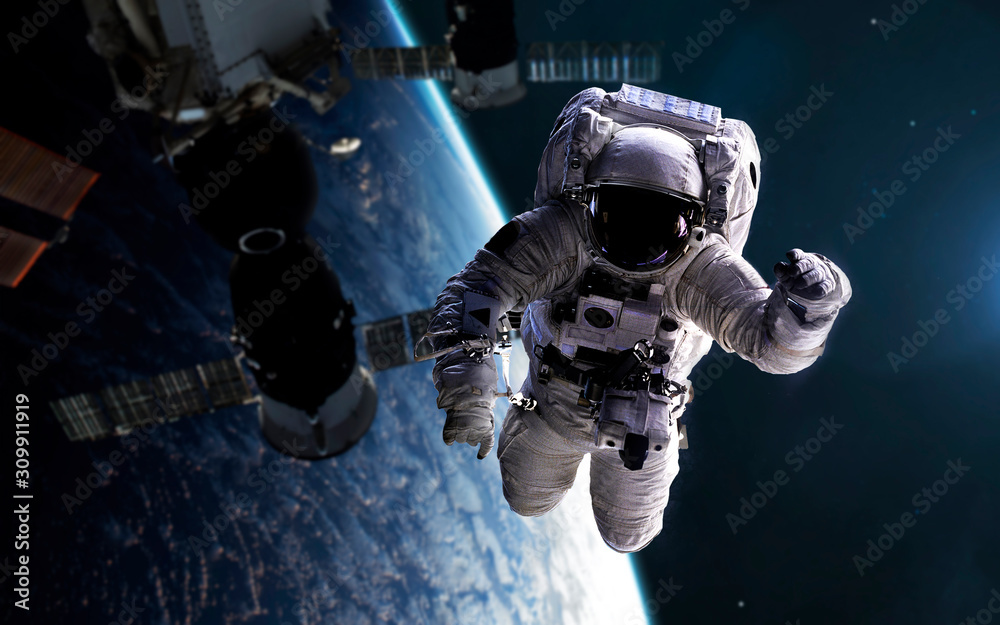 Astronaut at spacewalk with space station at background. Elements of this image furnished by NASA