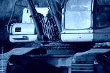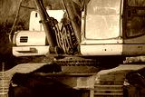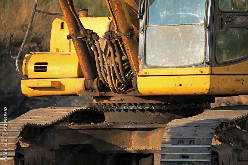 Excavator (digger) at a construction site close-up. Construction machinery at the facility. Building a new housing estate. Construction of modern multi-storey walled residential buildings