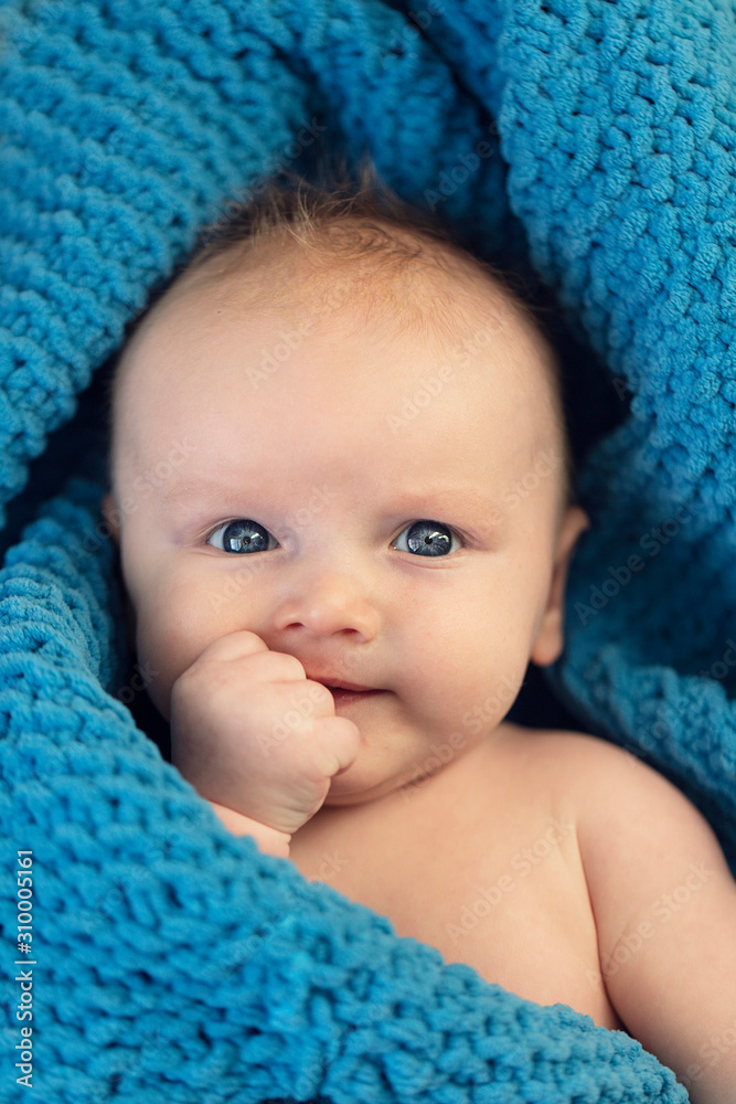 A cute baby boy hugging a soft blue blanket