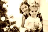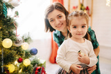 Happy family mom and daughter on a Christmas winter sunny morning in a decorated Christmas celebration room with a Xmas tree and gifts.