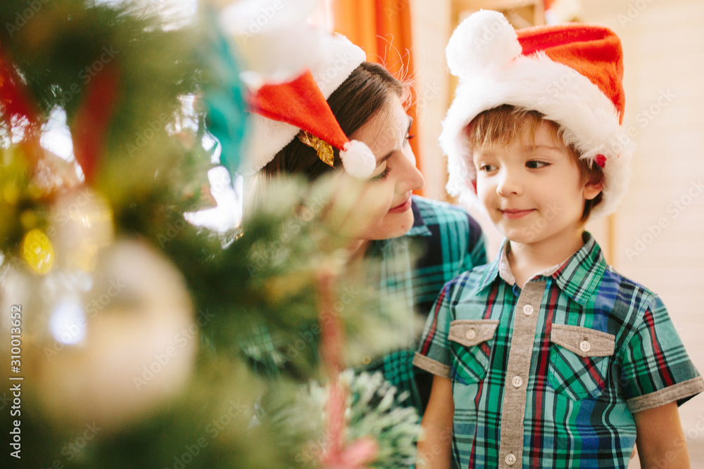 Happy family mom and son on a Christmas winter sunny morning in a decorated Christmas celebration room with a Xmas tree and gifts.