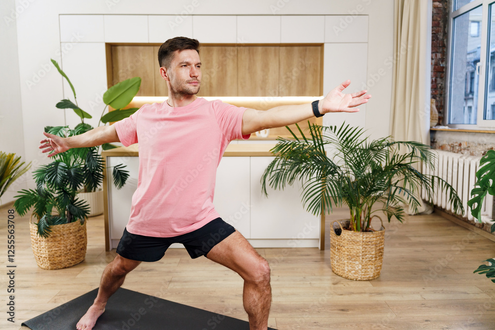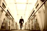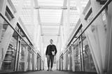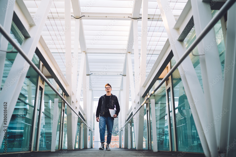 Young trainee carrying laptop with documents while walking in hall