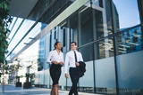 Happy young coworkers walking on street