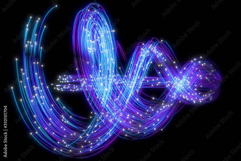 Beautiful abstract flowing traces on a black background. Glowing dots. 3d rendering image.