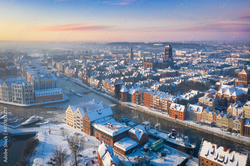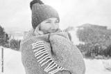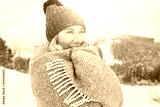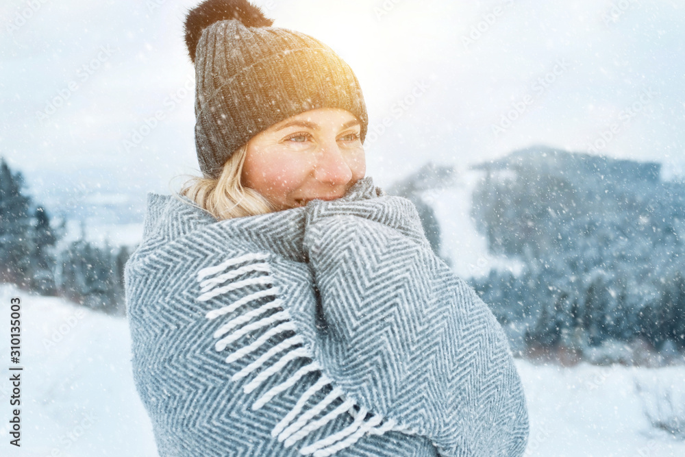 Portrait Happy woman traveler on the snowy of mountain look on t
