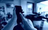 Hand of a businessman hold smartphone and use finger point to empty screen.