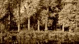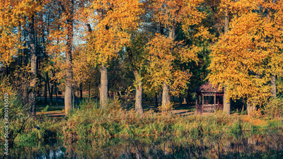 autumn city park with a gazebo in the shade of bright orange-yellow trees by the river