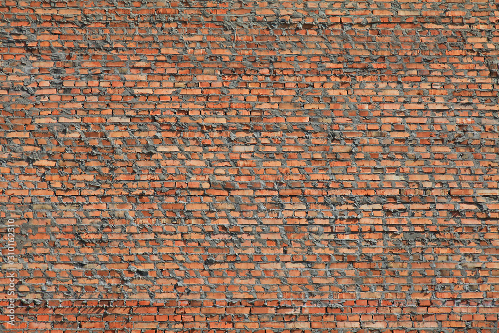 Red bricks wall texture and background. The fragment of bad and dirty bricklaying with cement smeared bricks. Сonstruction of a new multistory building. Construction site