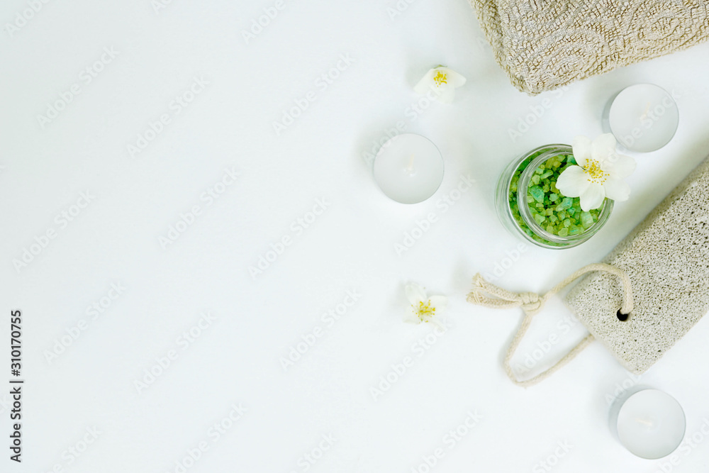 Sauna SPA Concept, salt for foot bath body care accessories and crandles on white background, copy space.