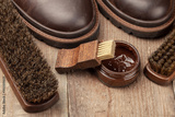 Shoe shine. Brushes for cleaning and polishing shoes. Cream brush and boots