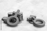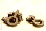 Discrimination of men. A large stack of coins and a gender symbol of a woman and a small stack of coins and a gender symbol of a man. Salary discrimination