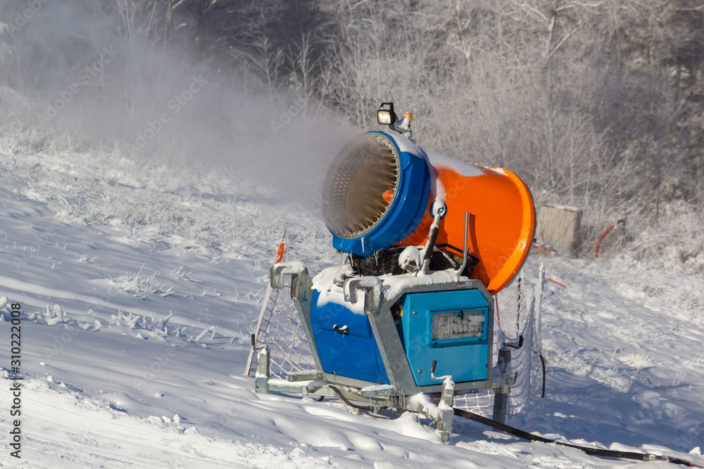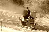 Snowmaking by snow cannon at Jaworzyna Krynicka Mountain Ski Area. Krynica-Zdroj Resort, Poland.