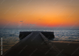 sunset at the pier in the Indian Ocean with a orange sky at the horizon