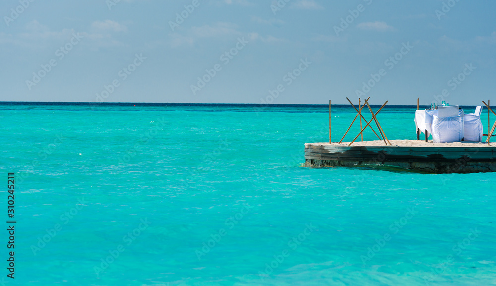 romantic dinner at the beach in the background is the ocean and a blue sky