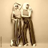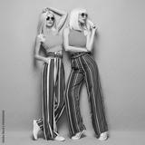 Two fashionable girl posing in Studio. Beautiful Adorable young woman in Stylish summer colorful outfit, Trendy dyed hair, make up. Glamour model sister friend, fashion concept on blue, full-length