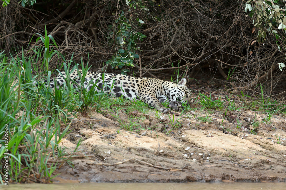 Jaguar sleeping on a river bank