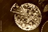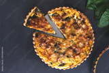freshly bake leek bacon spinach quiche on dark blue background with copy space, vertical, top view