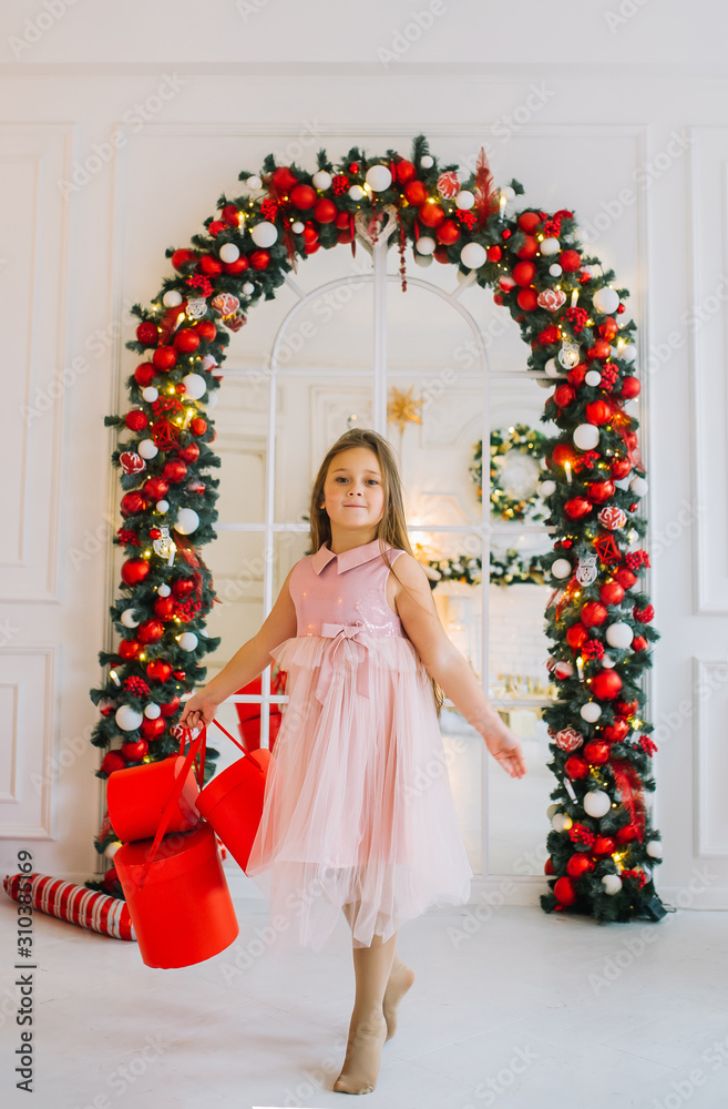 Smiling smiling girl in festive dress with red gift boxes.