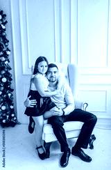 Happy father with daughter sitting in an armchair near the Christmas tree.
