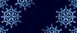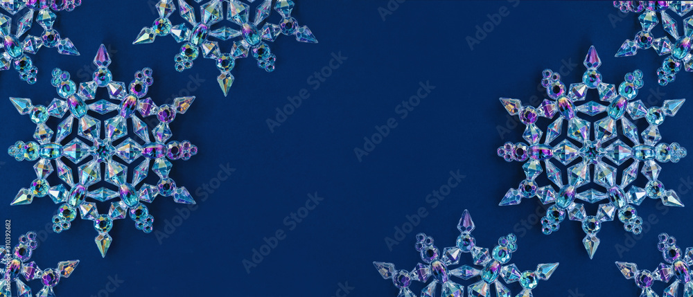 Banner with holographic clear glass snowflakes on dark blue background. Minimal christmas concept. Open composition. Copy space. Year color trend 2020.