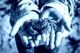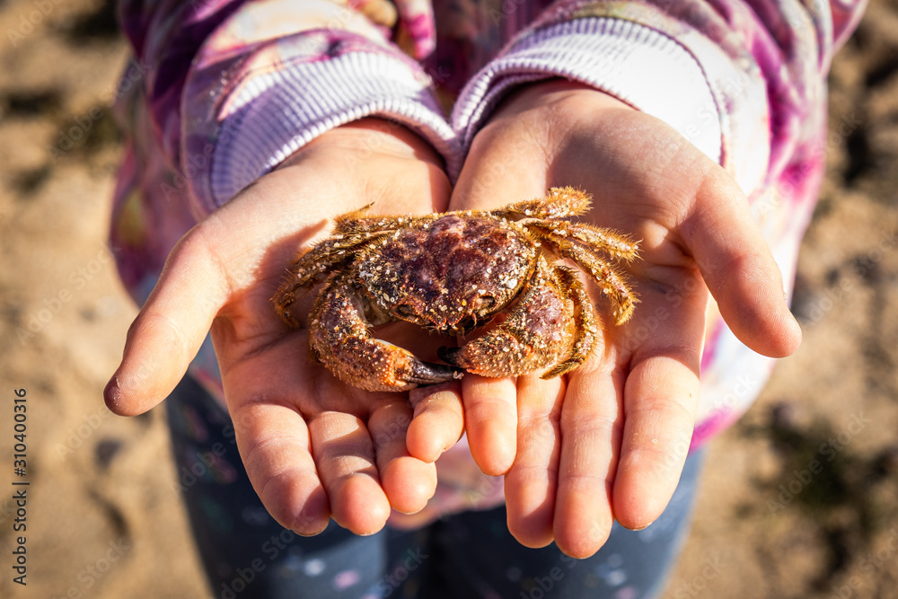 Girls hands holding a crab on the beach - closeup