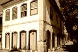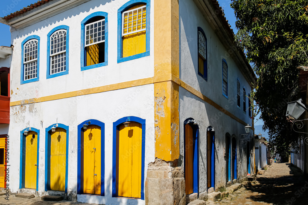 Corner of a two story colonial house with colorful facade in the late afternoon sun in historic town Paraty, Brazil