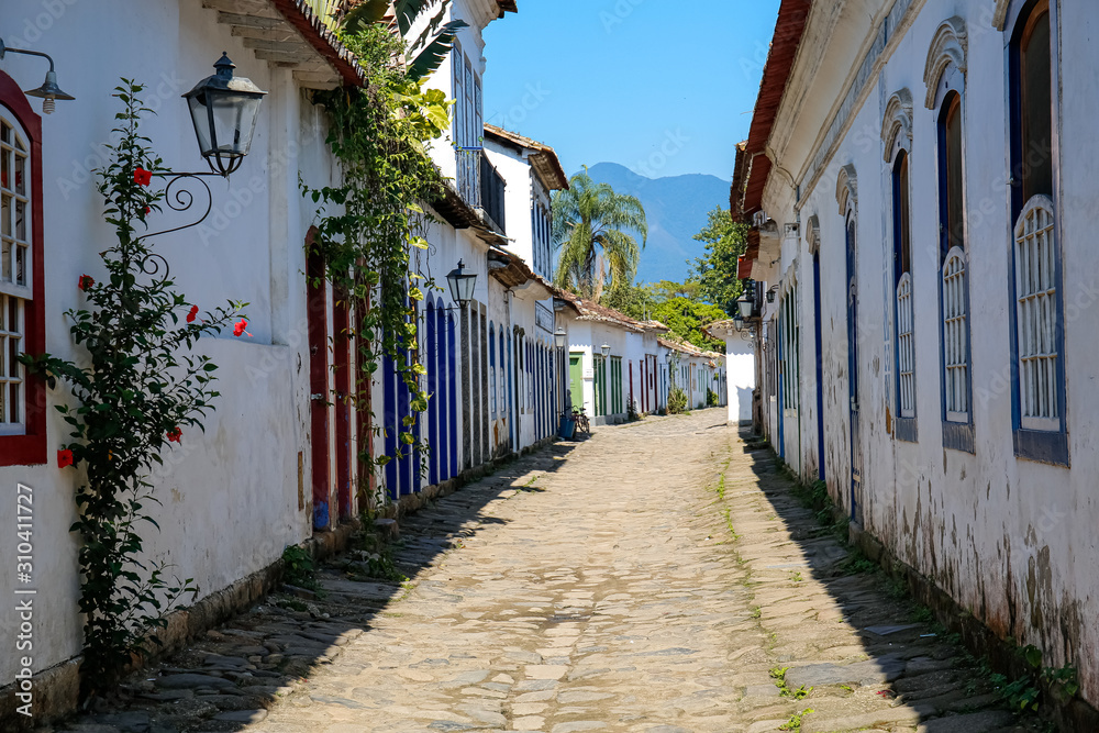 View to mountain through a typical cobblestone street with colonial buildings in the late afternoon sun in historic town Paraty, Brazil