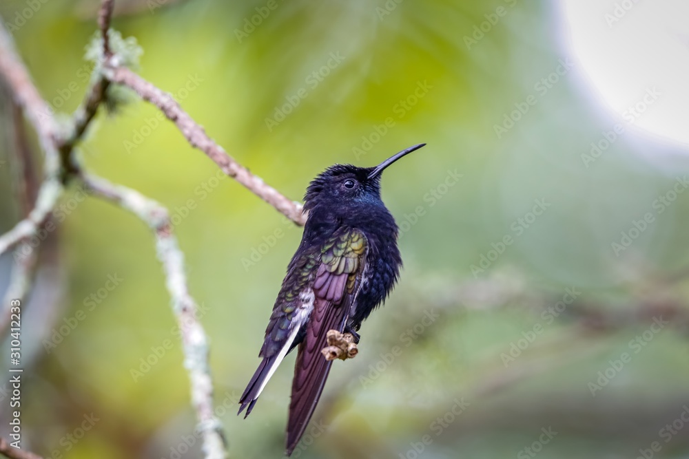 Close up of a Black Jacobin perched on a branch against bright green defocused background, Serra da Mantiqueira, Atlantic Forest, Itatiaia, Brazil