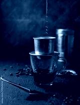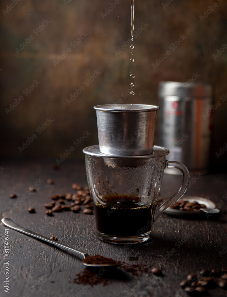 Preparation of Vietnamese coffe with aluminum cofe filer on dark background
