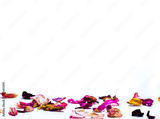 Falling colorful rose paddles with a white planin background