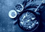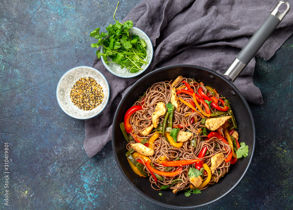 Japanese dish buckwheat soba noodles with chicken and vegetables carrot, bell pepper and green beans in wok on dark blue background