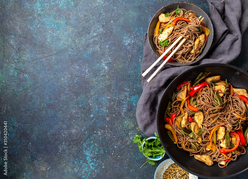 Japanese dish buckwheat soba noodles with chicken and vegetables carrot, bell pepper and green beans in grey bowl, top view, copy space