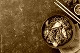 Japanese dish buckwheat soba noodles with chicken and vegetables carrot, bell pepper and green beans in grey bowl, top view, copy space