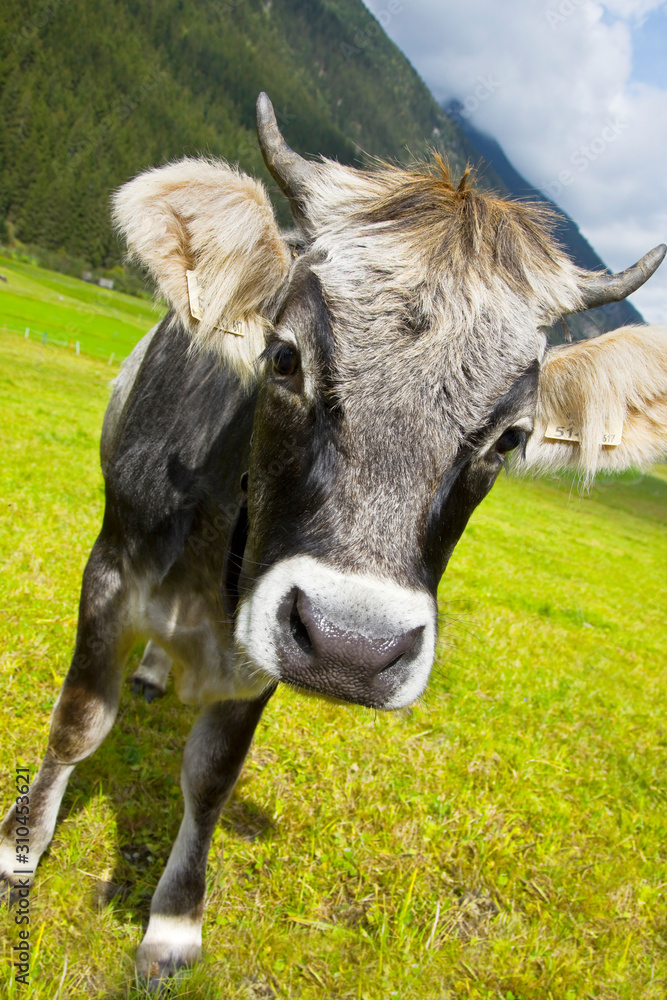 Young pretty bull on the pasture in the “Stubai Valley“ in Austria.
