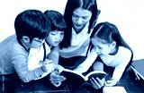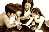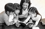 The beautiful woman and three kids reading book together,at classroom,black and white tone,blurry light around