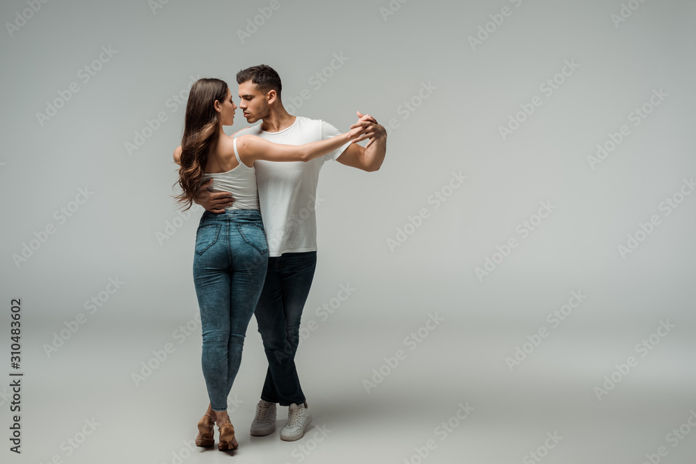 dancers in denim jeans dancing bachata on grey background