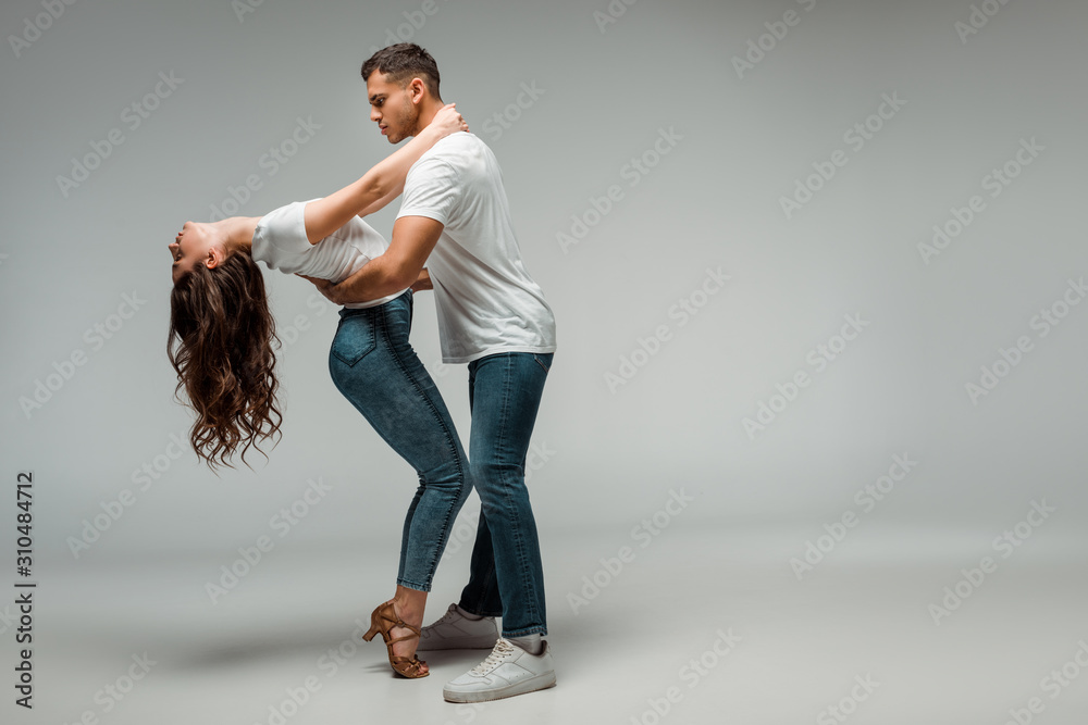 side view of dancers in t-shirts and jeans dancing bachata on grey background