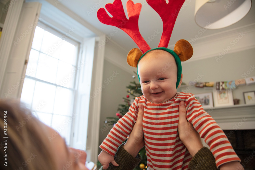 Cute baby wearing festive reindeer antlers playing with mum at christmas