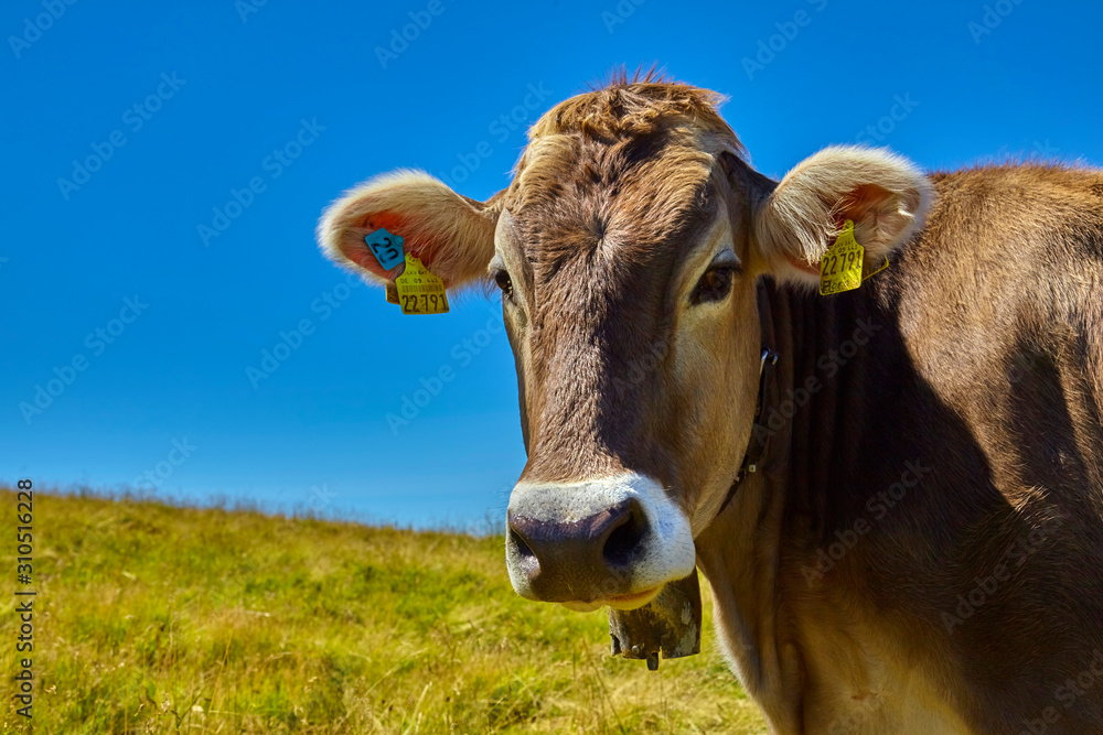 Beautiful portrait of an alpine cow in the mountains