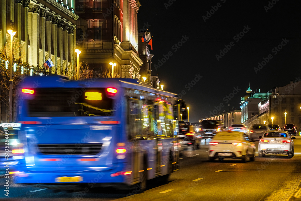 Moscow, Russia - October, 28, 2019: image of a bus on a night street in Moscow