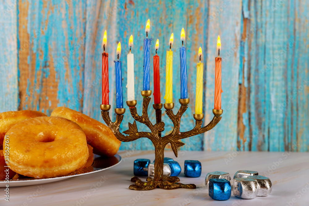 Jewish holiday Hanukkah with menora, donuts and dreidels.