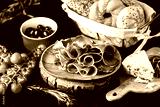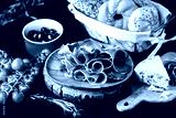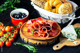 Wine appetizer on a wooden board. white wine cheese, jamon, prosciutto, with salami and olives on a black background. freshly baked bread with cheese and wine snacks. Tasty party snacks