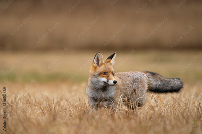Red fox in yellow grass. Curious animal. Vulpes vulpes.
