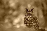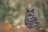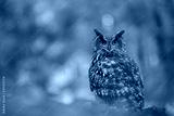 Eurasian eagle-owl in beaty blured forest background. Bubo bubo