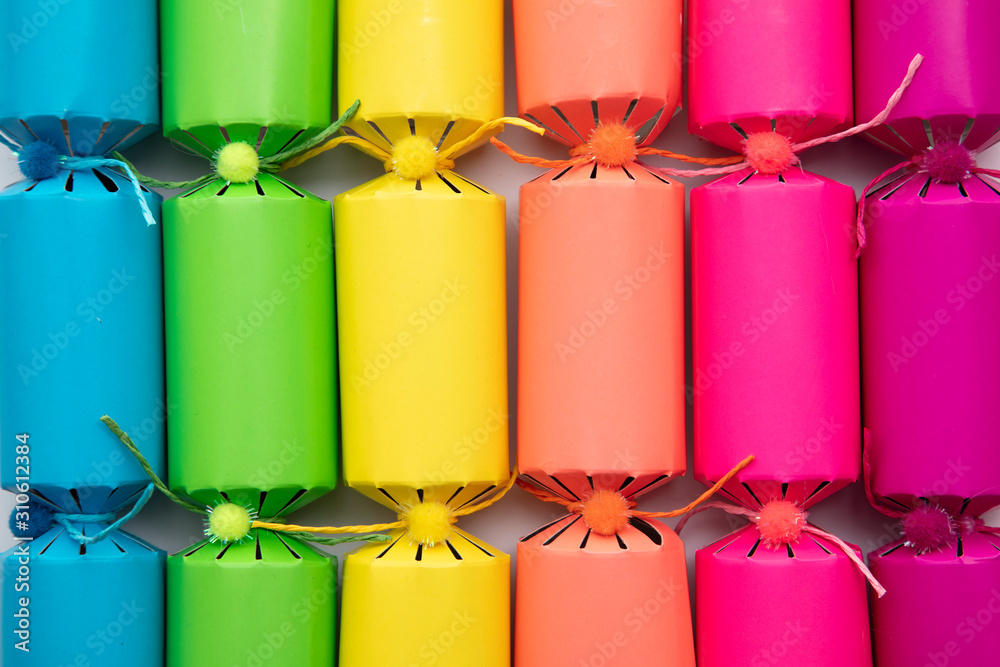 Bright colourful hristmas crackers on a plain background. festive layflat