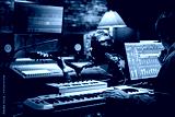 professional male music producer, composer working with guitarist in recording studio. music production concept