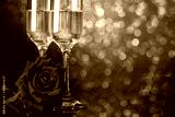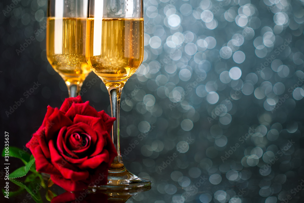 Champagne glasses on a beautiful bokeh background. Valentine's day. Background with copy space. Selective focus. Horizontal.